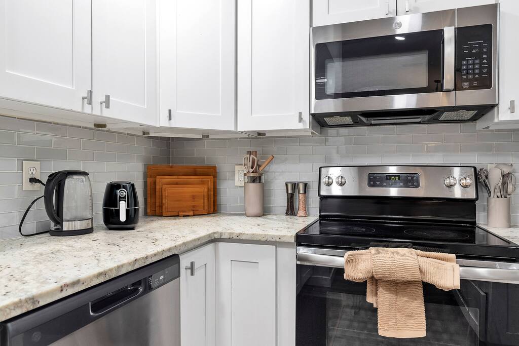 We provide all the kitchen supplies , verities of spices , salt & paper, cookware, air fryer sheets, olive oil and wine glasses. All you need for daily comfort life. Enjoy !